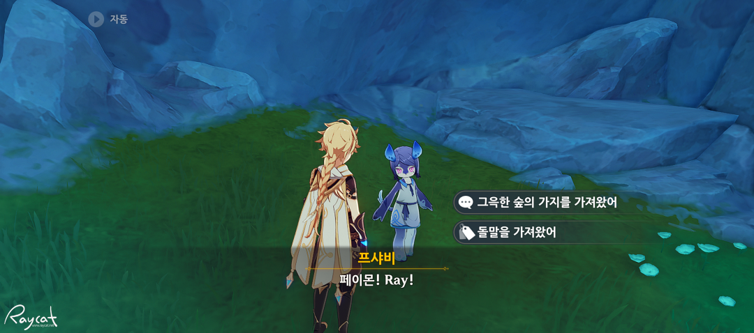 돌말로 상점의 물건을 모두 구매 했다면 프샤비에게 대화를 걸어 이제 '그윽한 숲의 가지'를 프샤비에게 주면 프샤비와 몇 번의 대화후 작별인사를 하며 프샤비가 사라지며 원석 40개를 줍니다.