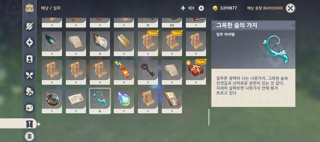 '그윽한 숲의 가지'는 폰타인 월드 퀘스트와 관련된 임무 아이템으로 모두 6개가 필요합니다.