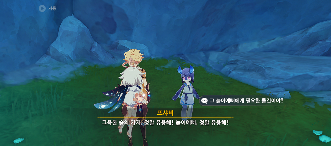 돌말로 상점의 물건을 모두 구매 했다면 프샤비에게 대화를 걸어 이제 '그윽한 숲의 가지'를 프샤비에게 주면 프샤비와 몇 번의 대화후 작별인사를 하며 프샤비가 사라지며 원석 40개를 줍니다.