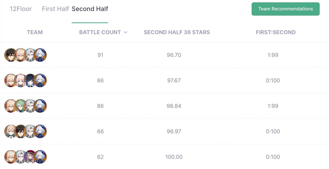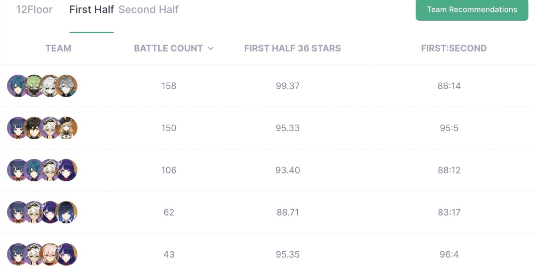12층 전반부는 '알나행시' 그리고 나비아가 들어간 '나향종베' 조합이 1, 2위로 나비아 조합은 꽤 다양하게 나올 수 있는데 이번에 픽업한 캐릭터라 나비아를 활용한 유저가 많은 것 같습니다.