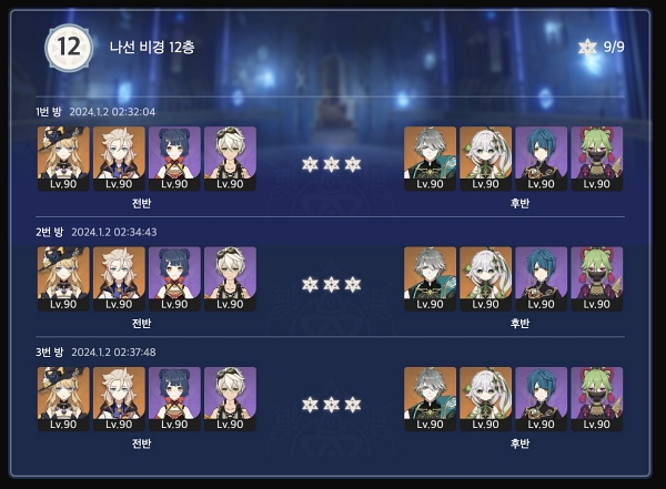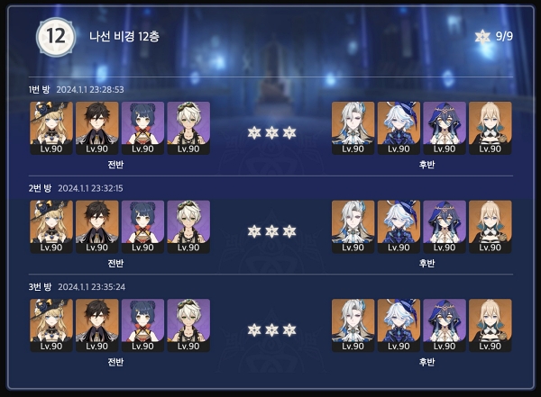 4.3 버전의 나선비경 자체가 크게 어렵지 않으니 원소조합만 잘 구성해서 플레이하면 무난하게 36별 클리어가 가능하리라 봅니다.
