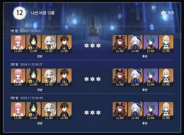 4.3 버전의 나선비경 자체가 크게 어렵지 않으니 원소조합만 잘 구성해서 플레이하면 무난하게 36별 클리어가 가능하리라 봅니다.