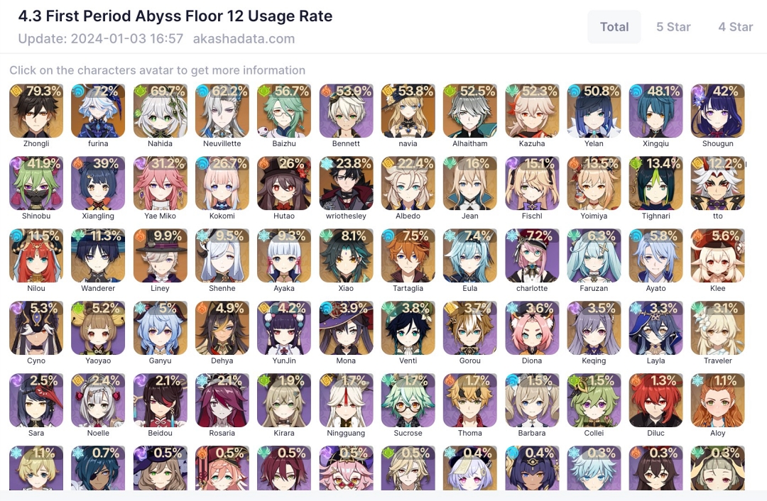 1월 3일까지 아캬사에 등록된 나선비경 캐릭터 전체 픽률을 보면 종려와 베넷이 다시 상승세에 코코미는 하락세이며 나머지는 지난 나선비경과 비슷한데 이번게 픽업 중인 나비아의 픽률이 50%를 넘어가고 있습니다.