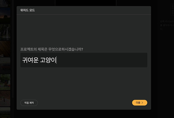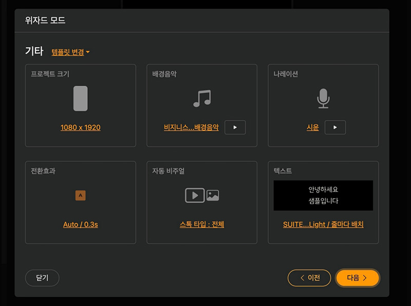 위자드 모드에서 지금 만들고 있는 영상의 규격을 확인해 볼 수 있는데 여기서 프로젝트의 크기를 바꾸거나 이미지를 넣고 배경음악, 내레이션 폰트 등을 설정할 수 있습니다.