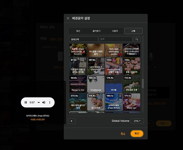 제가 생각했던 것보다 배경음악부터 다양한 폰트를 제공하고 있는데 템플릿도 많이 제공하고 있습니다.