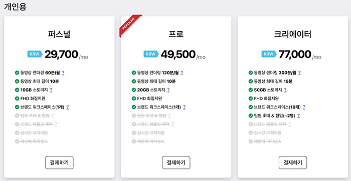 숏폼 영상을 자주 제작하는 사람이 아니라면 매월 요금은 부담될 수 있습니다. 조금 아쉽다면 필요할 때 잠깐 사용할 수 있는 요금이 있다면 더 괜찮을 것 같기도 합니다.