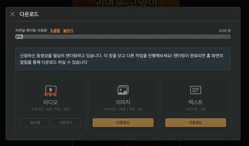 영상 제작이 끝나면 다운로드를 하면 되는데 틱톡이나 유튜브 쇼츠등과 같은 숏폼 영상은 길이가 짧아서 영상 렌더링 시간도 길지 않기 때문에 렌더링도 빠르게 끝납니다.