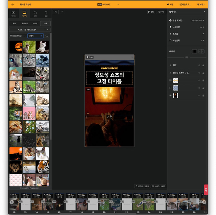 그리고 영상에 사용하고 싶은 이미지가 있다면 왼쪽의 패널에서 특정 단어를 넣고 검색하면 이미지를 찾아주는데 위 캡처 화면은 고양이란 단어를 넣고 검색해 본 화면입니다.