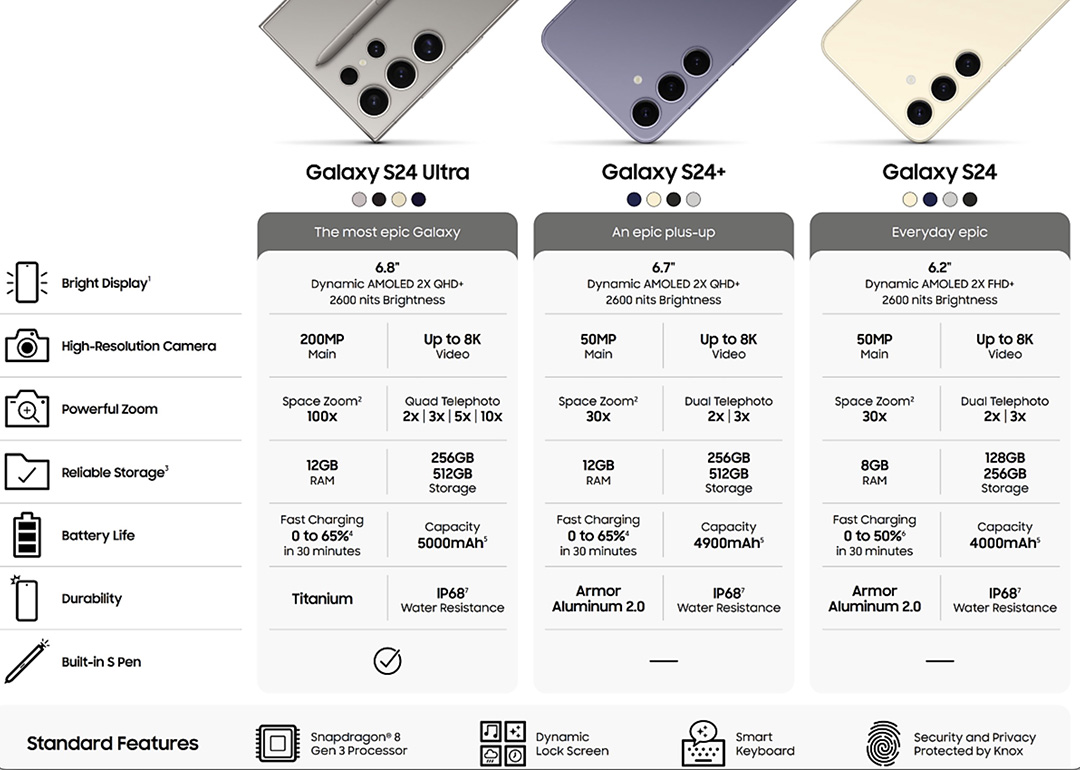 갤럭시 S24 시리즈의 공식 컬러가 유출되며 스펙도 유출되어 아래 이미지를 보면 차이점을 알 수 있습니다.