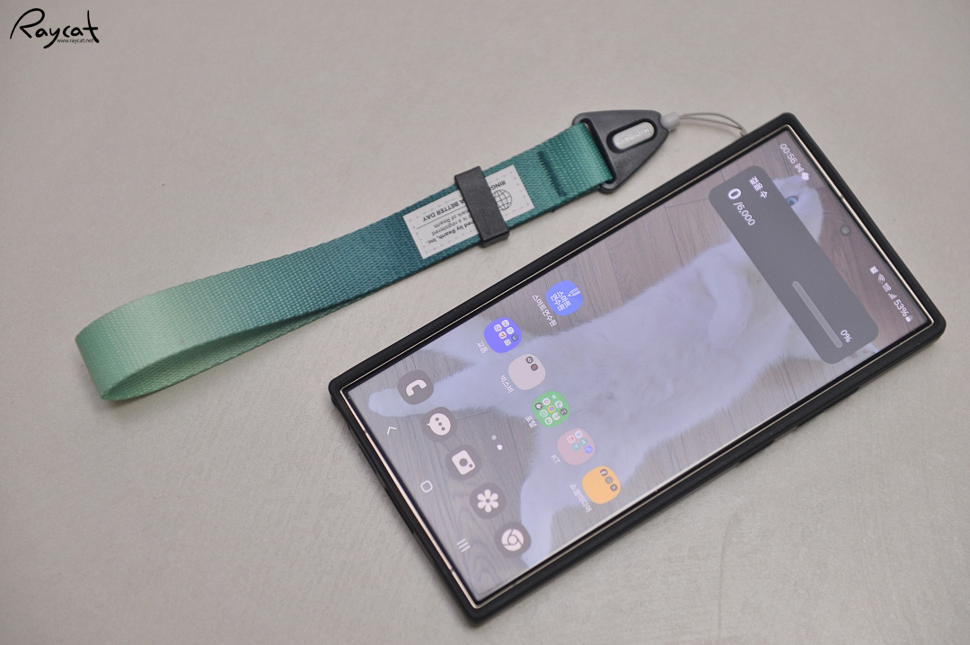 핸드스트랩을 스마트폰에 부착하면 위 사진과 같은 형태로 끈의 폭이 조금 더 얇았으면 어땠을까 하는 생각도 듭니다.