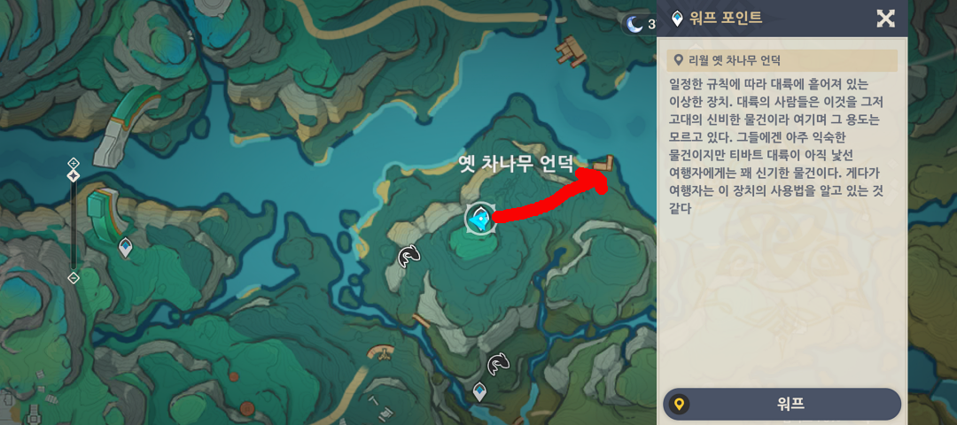 옛 차나무 언덕의 워프에서 화살표 방향으로 이동합니다.