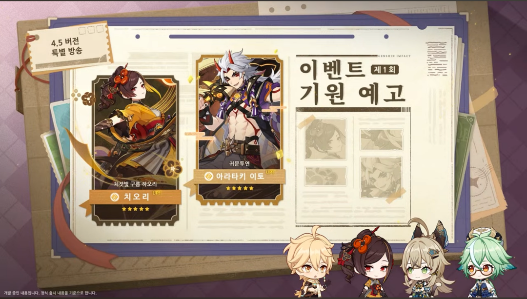 전반부는 둘 다 바위원소 캐릭터로 치오리와 아라타키 이토가 전반부 픽업이며 무기의 경우 신규는 치오리의 전용무기 한손검 '우라쿠의 미스리기'와 이토의 전용 무기인 '쇄석'이 나오게 됩니다.