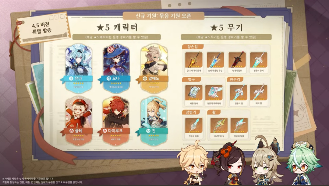 4.5 버전에서 묶음 기원은 한정 캐릭터인 유라와 알베도가 포함되어 있으며 무기를 보면 사냥꾼 활과 유라 전용 무기인 송뢰가 포함되어 있습니다.