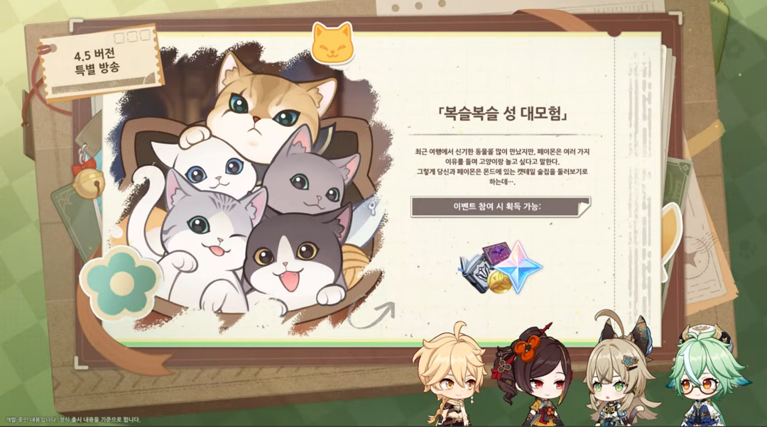 4.5 버전에서 메인 스토리 진행이 없어서 대부분 이전에 했던 미니게임류의 이벤트가 있는데 도전 콘텐츠와 고양이 키우기, 연금술과 관련된 이벤트가 있습니다.