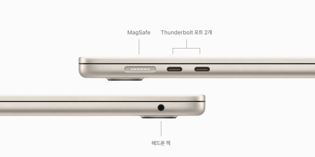 M2 맥북에어와 동일하게 M3 맥북에어는 13, 15인치 2가지 모델로 나오며 컬러나 디자인은 크게 달라지지 않았습니다.