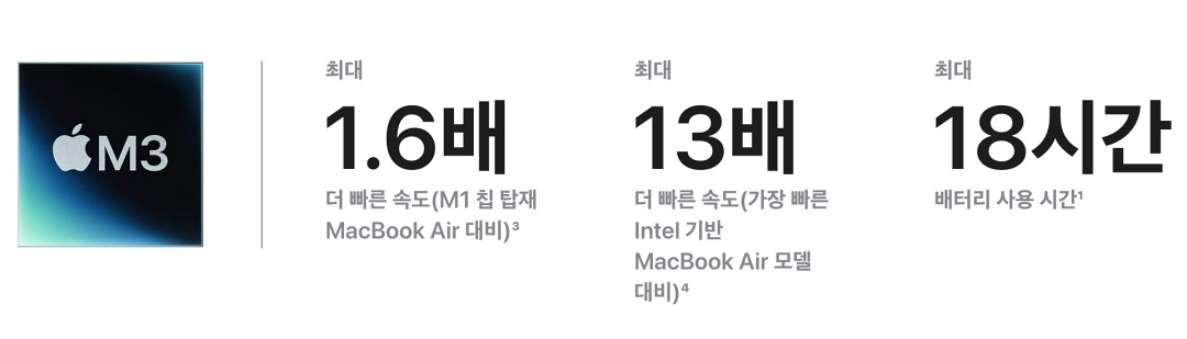 지난 4일 애플 홈페이지를 통해 M3 칩셉을 탑재한 뉴맥북에어 13과 15를 공개했습니다.