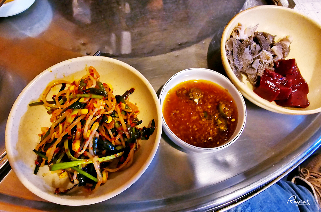 주메뉴 외 나오는 건 사실 참 간단한데 이상하게 생마늘이 안 나왔다. 콩나물국과 콩나물무침과 간과 천엽 소금장과 양념장이 따로 나온다.