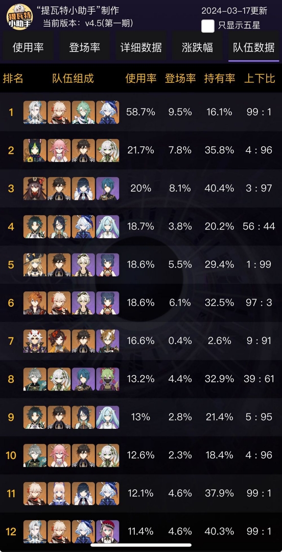 다음 4.6 버전 픽업이 아를레키노인 데다 4.5 버전 후반부 픽업에 느비예트와 카즈하가 있어서 그런지 이번에 보유율을 보면 치오리는 많이 픽업한것 같지 않습니다.