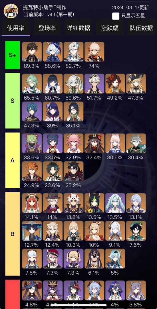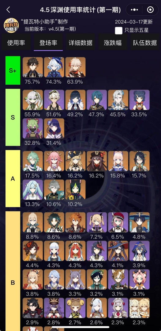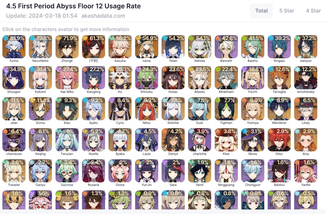 픽률을 보면 아마 이번 픽업 신캐가 치오리가 사용률이 꽤 높은데 몹 배치 때문에 바위, 물, 풀 원소 캐릭터들이 픽률이 높습니다.