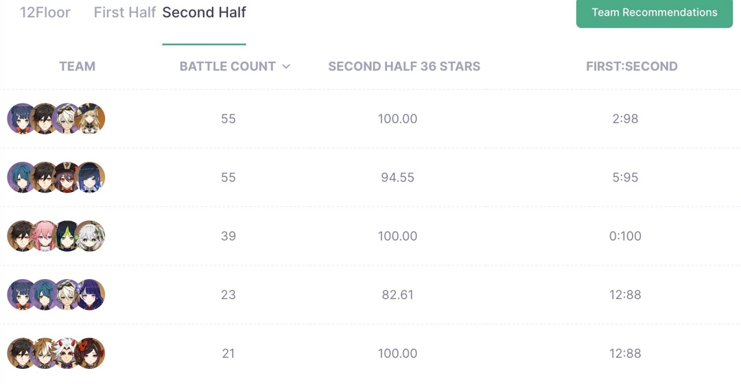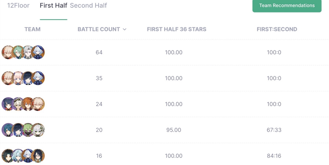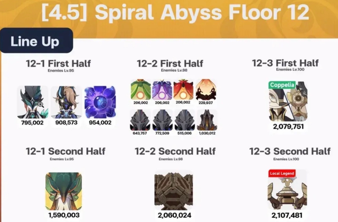 12층 전반부 파티 조합을 보면 물원소 캐릭터들이 대거 포함되어 있으며 후반부 파티조합을 보면 '연산 증폭기' 때문에 바위 원소 캐릭터가 필요해 바위 캐릭터들이 하나씩 포함되어 있음을 확인할 수 있습니다.