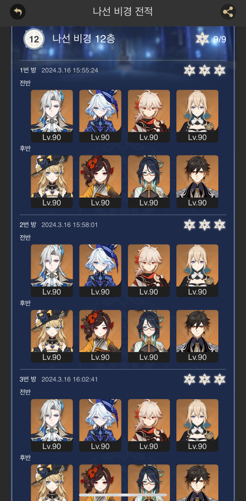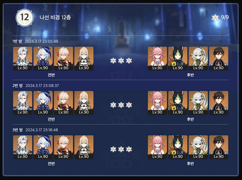 아래는 제가 활용했던 이번 4.5 버전 나선비경 12층 조합입니다.