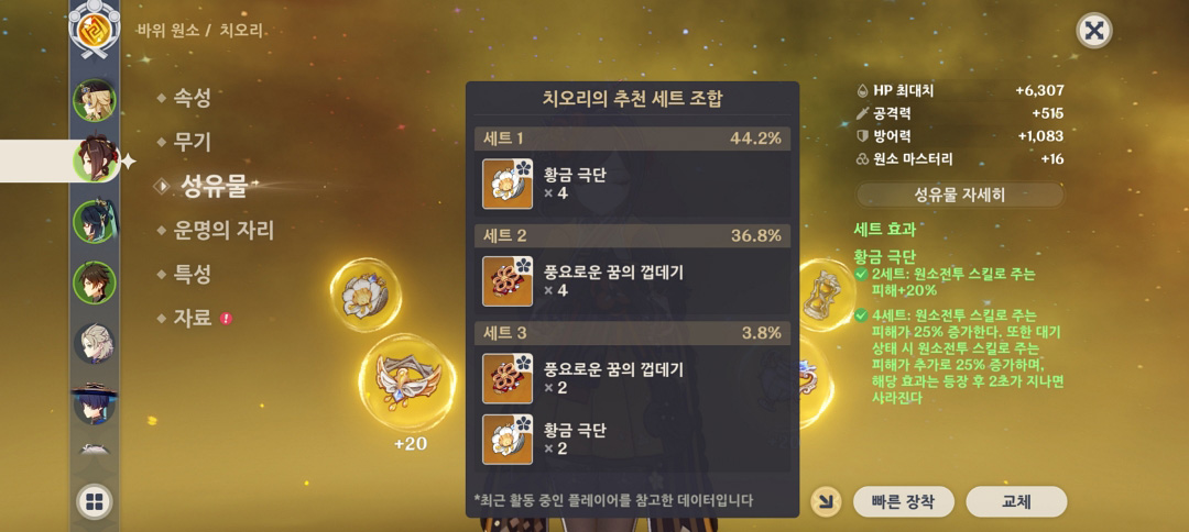 성유물 추천 세트 조합을 보면 다른 유저들 세트 사용률이 보이는데 치오리의 경우 '황금 극단' - 44.2%, '풍요로운 꿈의 껍데기' -36.8% 순으로 3종류의 세트를 보여줍니다.