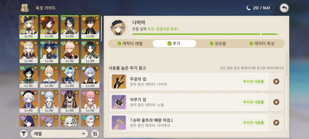 원신을 처음 플레이 하거나 플레이한 지 오래되지 않은 신규 유저나 아직 뉴비들을 위해 만들어진 시스템으로 캐릭터를 육성하는데 무기를 선택하거나 특성 업그레이드 순서 및 성유물 사용률을 확인해 볼 수 있습니다.