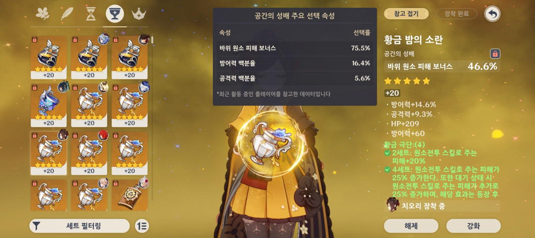 예를 들면 성배를 선택했을 때 주옵션이 가장 위에 보이며 나머지 옵션에 선호도가 보이는데 치오리의 경우 방어력이 딜에 영향을 주기 때문에 바위원소 성배에 방어력 백분율이 많이 붙은 성배를 많이들 사용하고 있습니다.