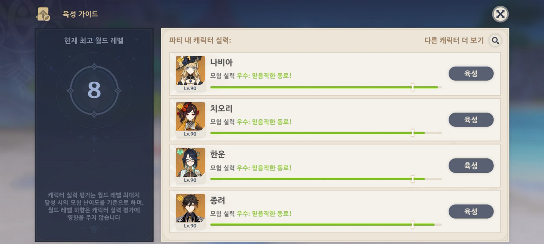 원신 페이몬 메뉴에서 '육성 가이드'를 탭 하면 아래와 같은 현재 파티원의 육성도를 볼 수 있습니다.
