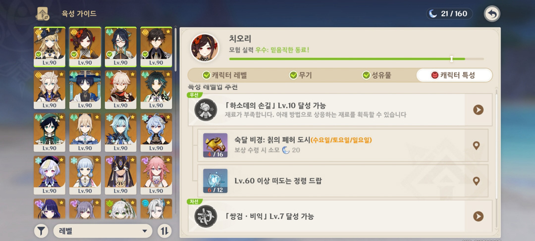 그리고 특성에 따라 필요한 책과 비경 날짜, 육성 재료의 숫자를 잘 보여주고 있습니다.