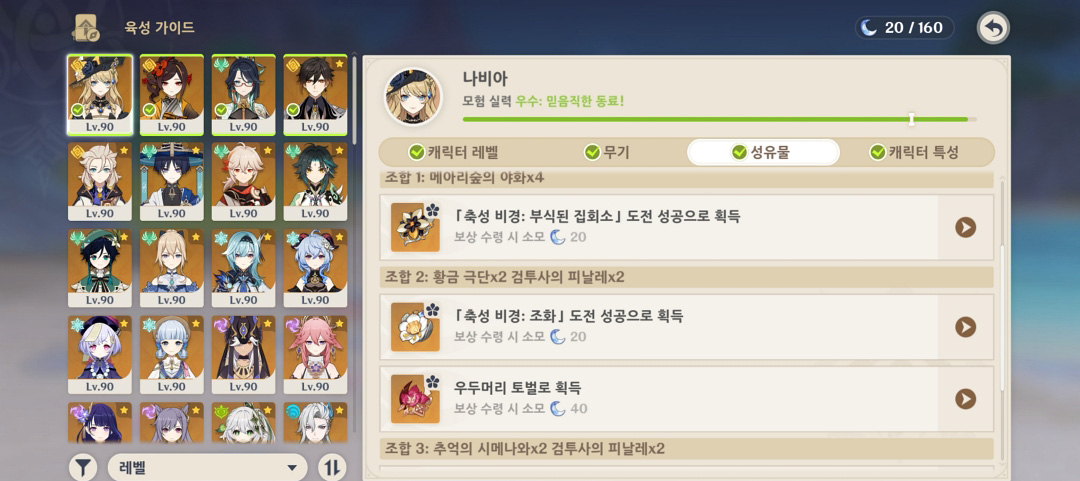 원신 페이몬 메뉴에서 '육성 가이드'를 탭 하면 아래와 같은 현재 파티원의 육성도를 볼 수 있습니다.