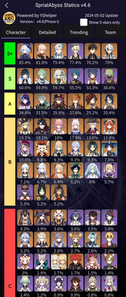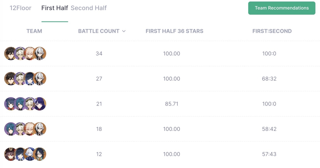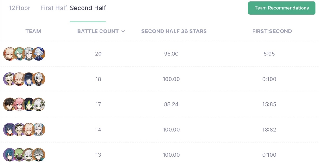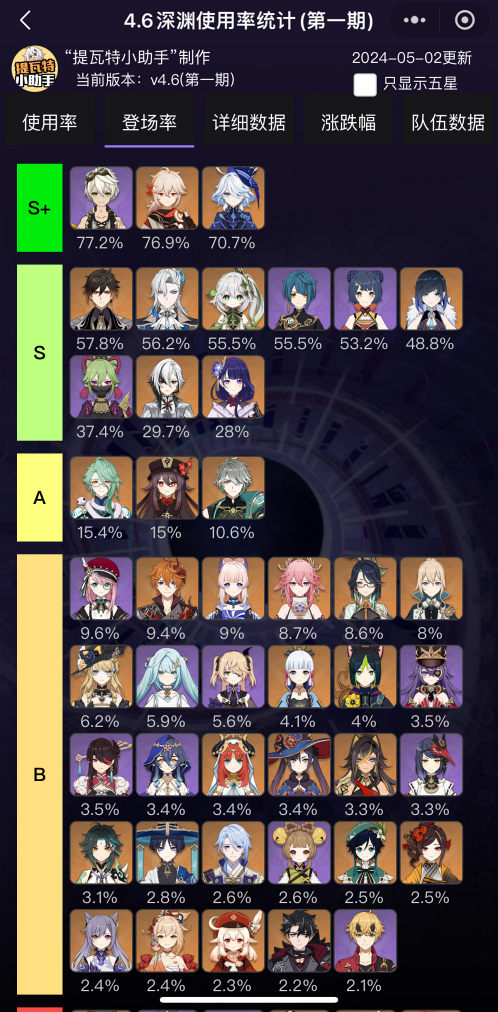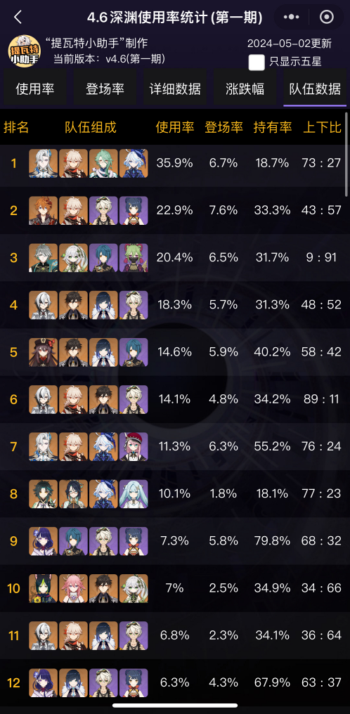 아카샤 통계도 비슷한데 아카샤는 아직 데이터가 많지 않은데 이번 4.6 버전 나선비경의 픽률과 파티조합은 아래와 같습니다.
