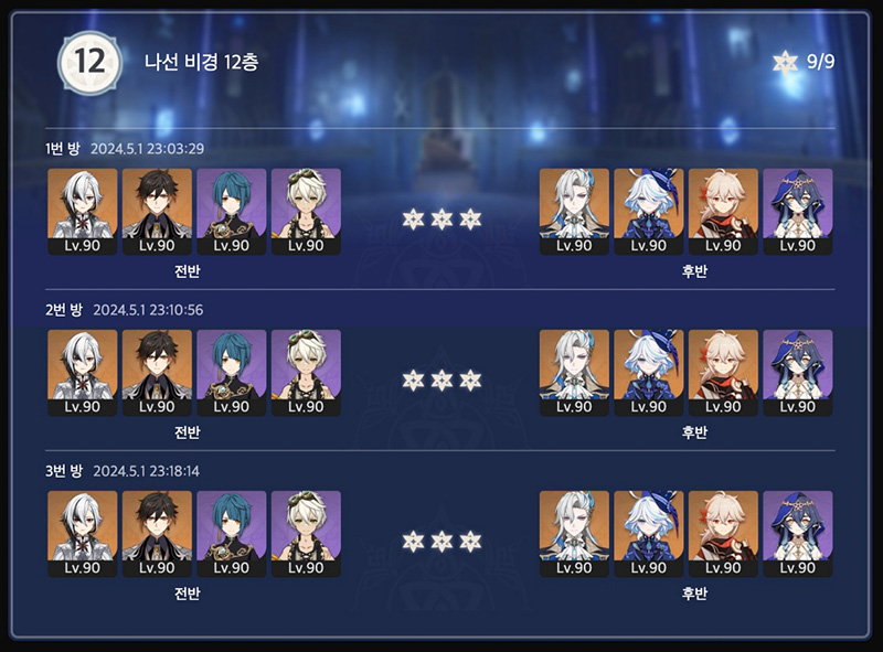 지난 나선비경보다 난이도가 좀 올라간 느낌인데 그래도 파티조합을 잘 구성하면 이번 나선비경 12층도 지난번에 36별을 했다면 이번 나선비경도 무난하게 36별 획득은 가능할 것 같습니다.