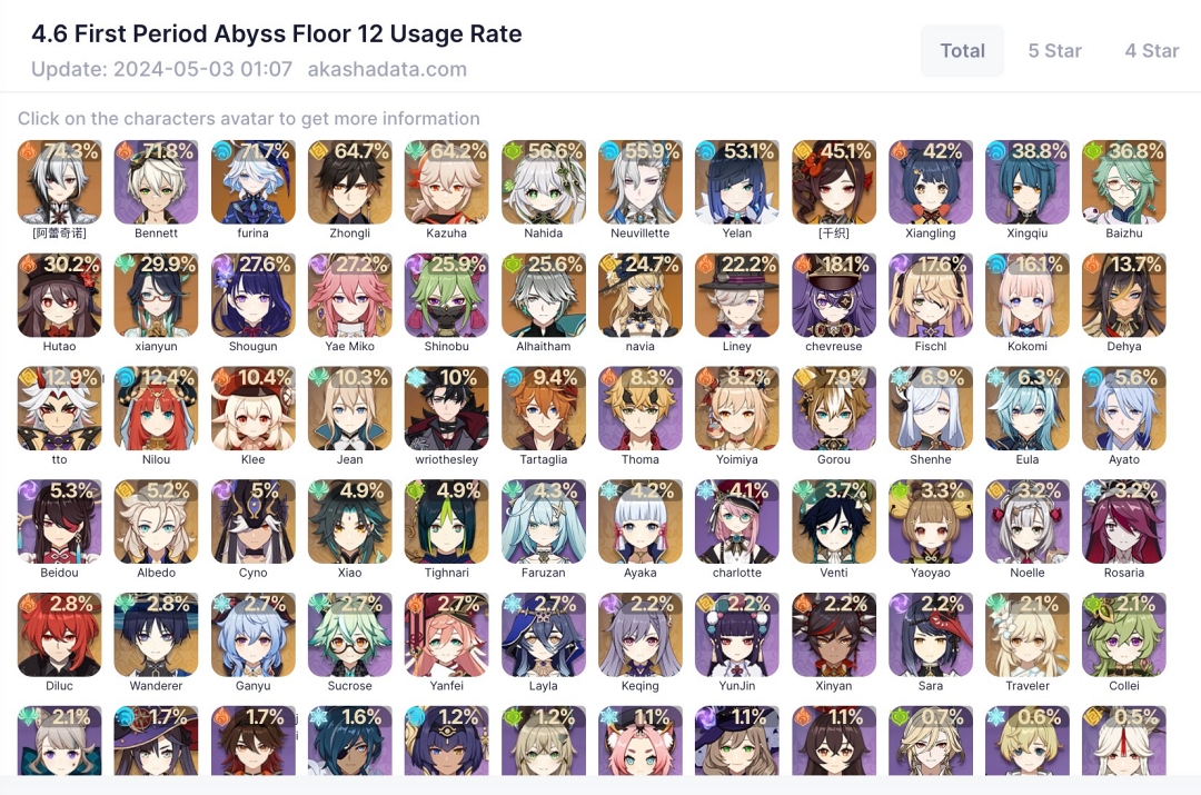 아카샤 통계를 보면 아를레키노 픽률이 상당히 높은데 아무래도 신캐인데다 성능이 꽤 좋아서 그런지 픽업한 유저들은 테스트로 꽤 많이 사용한 것 같습니다.