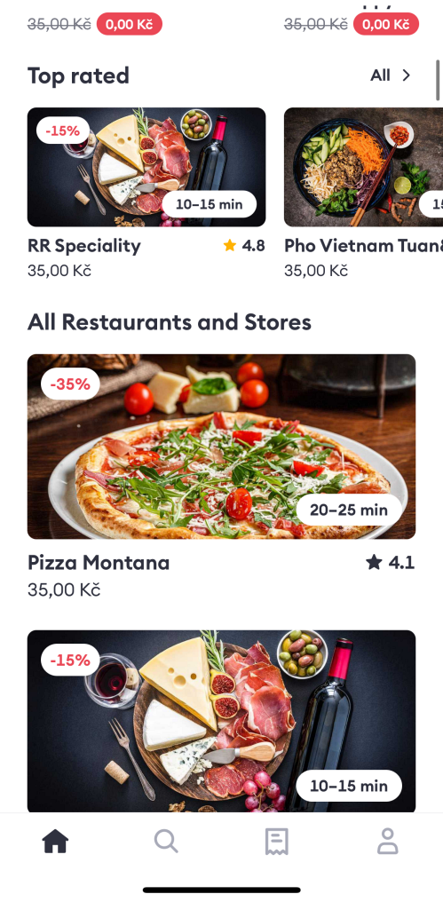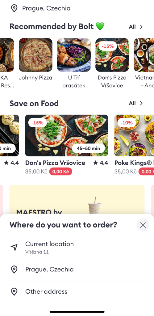볼트앱에서 볼트 푸드를 눌러보면 한국의 배민이나 쿠팡이츠를 사용하는 것과 같기 때문에 꽤 익숙한 느낌도 드는데 음식 주문 시 주의할 것은 주소로 주소가 체코어로 표기되어 나오기 때문에 지도에서 잘 확인해 보고 체크해야 합니다.
