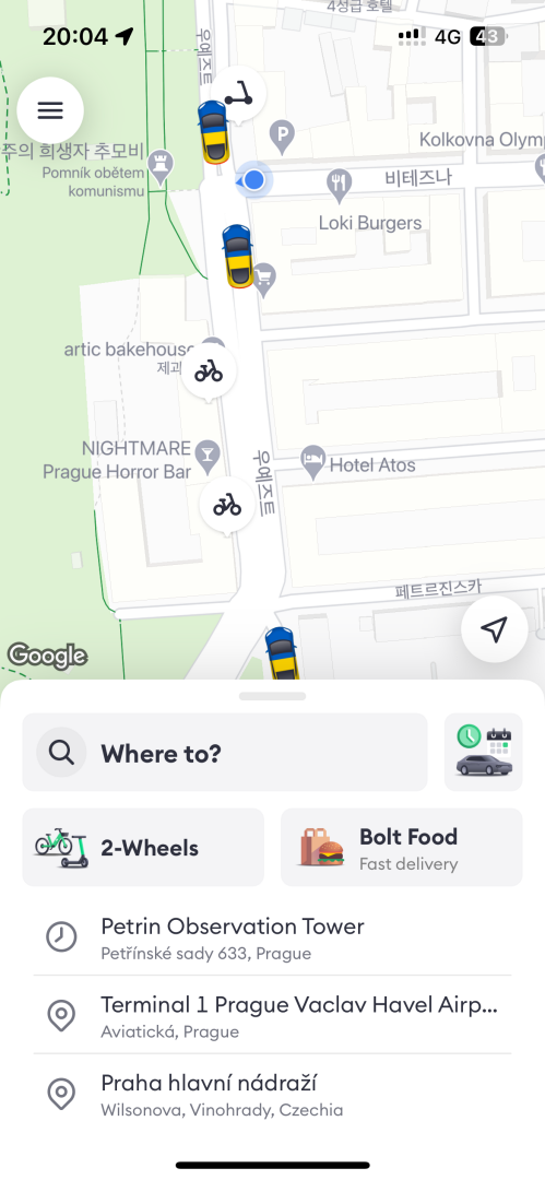 Pid litacka가 버스나 트램 대중교통을 이용하기 위한 앱이라면 볼트(Bolt)는 택시, 공유 킥보드와 자전거를 이용하기 위한 서비스입니다.