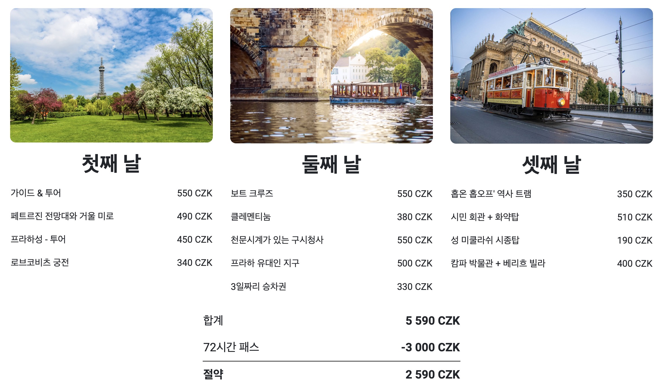 실제 프라하의 각각 주요 명소를 입장하는 가격과 비교하면 훨씬 저렴하게 이용할 수 있기 때문에 프라하를 처음 방문하는 여행자고 다양한 관광지를 방문한다면 꽤 도움을 받을 수 있습니다.