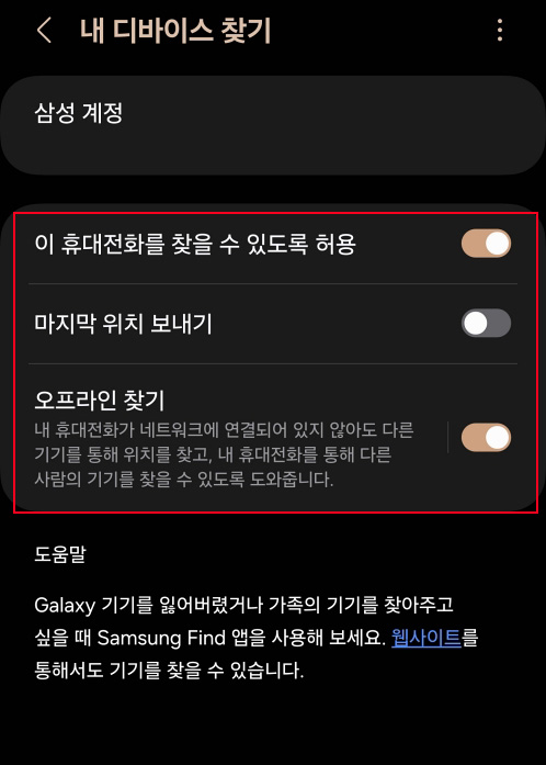 '분실 기기 보호 항목'에 보면 '이 휴대전화를 찾을 수 있도록 허용', '마지막 위치 보내기', '오프라인 찾기'가 있는데 모두 사용하도록 on 해줍니다.