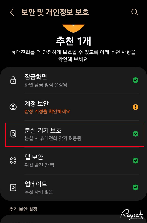 '보안 및 개인정보 보호'를 탭 하면 바로 '분실 기기 보호 항목'을 볼 수 있습니다.