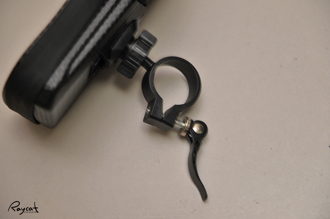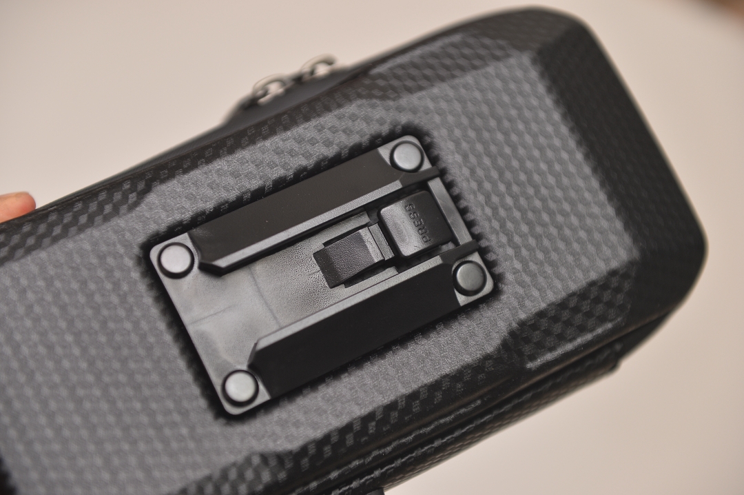 뒤쪽에 방수가방을 클램프에 결합하는 홈이 있으며 오른쪽 사진처첨 방수가방은 핸들 거치대에 저렇게 결합되며 고리를 돌리면 단단하게 핸들을 조이며 고정됩니다.