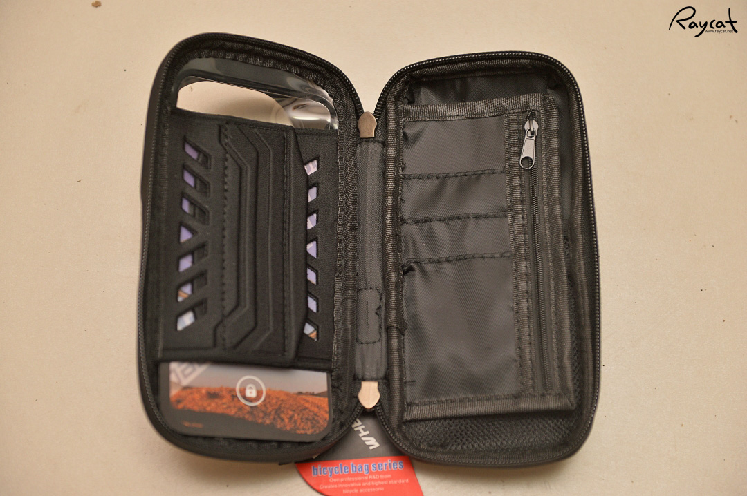 방수가방을 열어보면 안쪽에 스마트폰을 넣을 수 있는 공간과 카드나 동전, 담배 같이 작은 소지품을 끼울 수 있는 공간이 있습니다.
