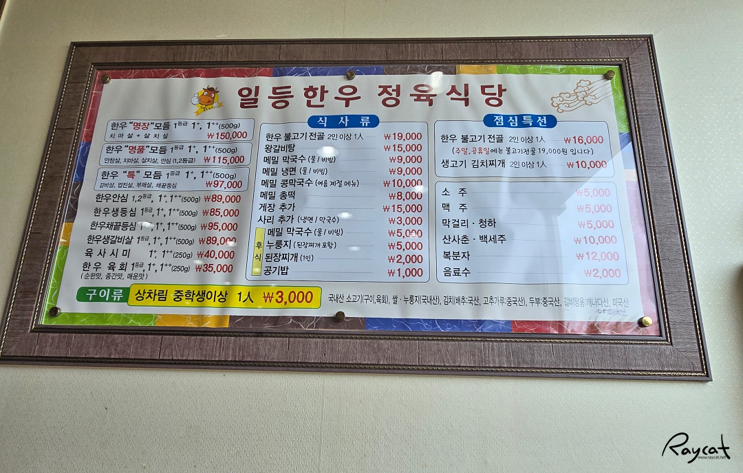 주차장도 넓고 식당과 정육점이 붙어있는데 주메뉴는 소고기, 한우불고기, 메밀국수가 있습니다.