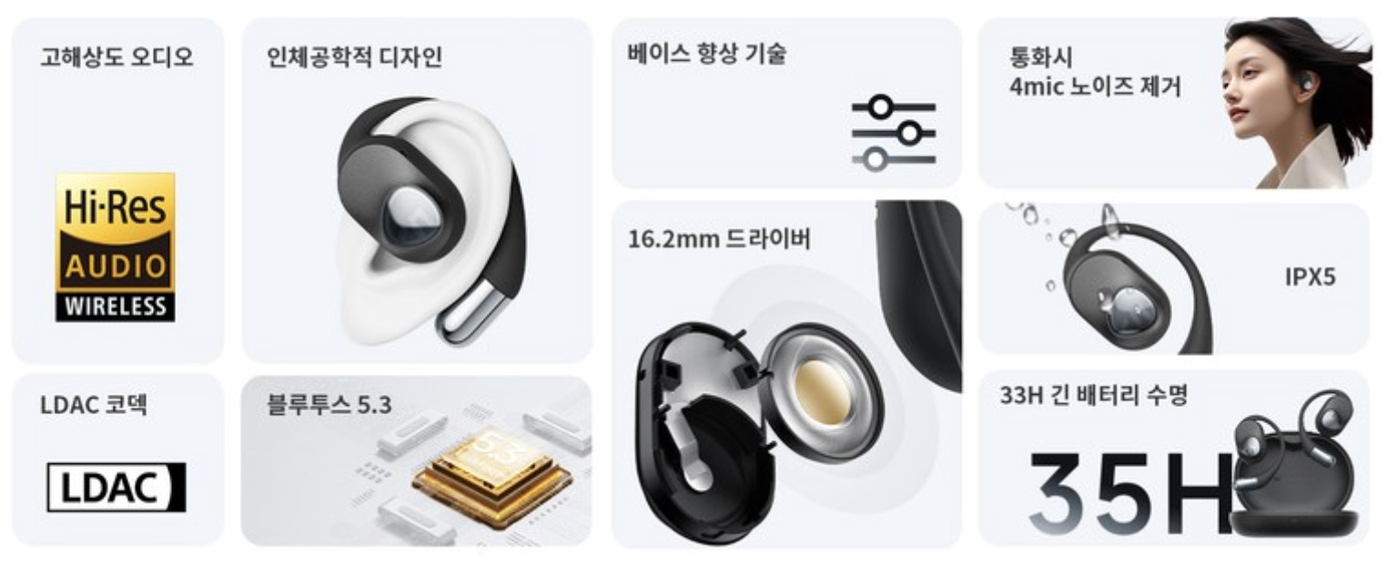 주요 특징을 간단히 나열하면 고해상도 오디오 지원, 블루투스 5.3, 16.2mm 드라이브, IPX5 방수, 배터리타임 최대 35시간입니다.