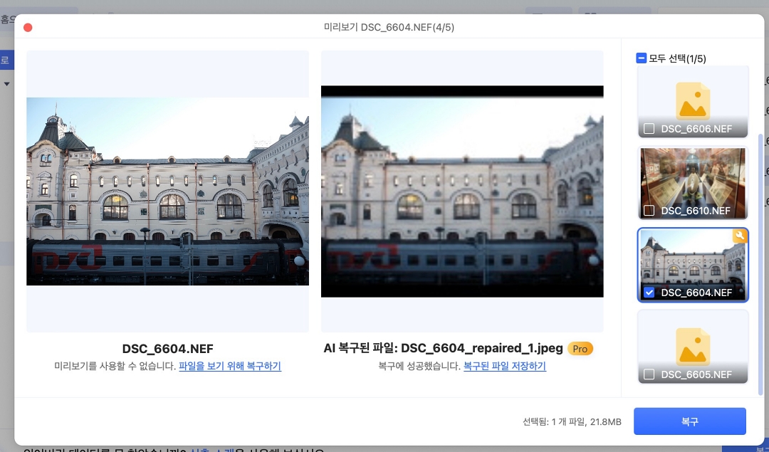 이미지나 영상 파일의 경우 미리 보기가 가능하기 때문에 미리 보기로 확인해 보고 복구를 누르면 파일이 바로 복구됩니다.