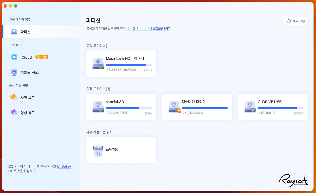 프로그램을 실행하면 기본 맥 저장소외 맥에 연결된 다른 저장장치들이 파티션 항목에 나열됩니다.