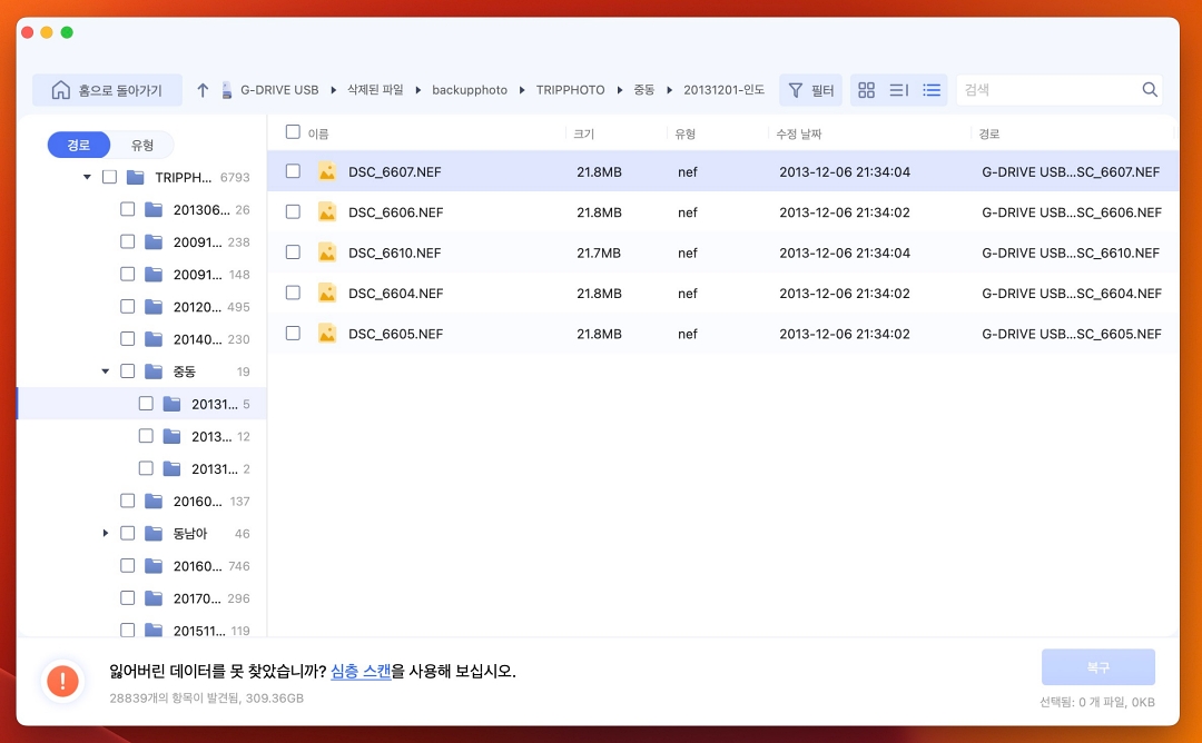저장소를 선택 후 스캔하면 삭제된 폴더와 함께 파일목록이 나옵니다.