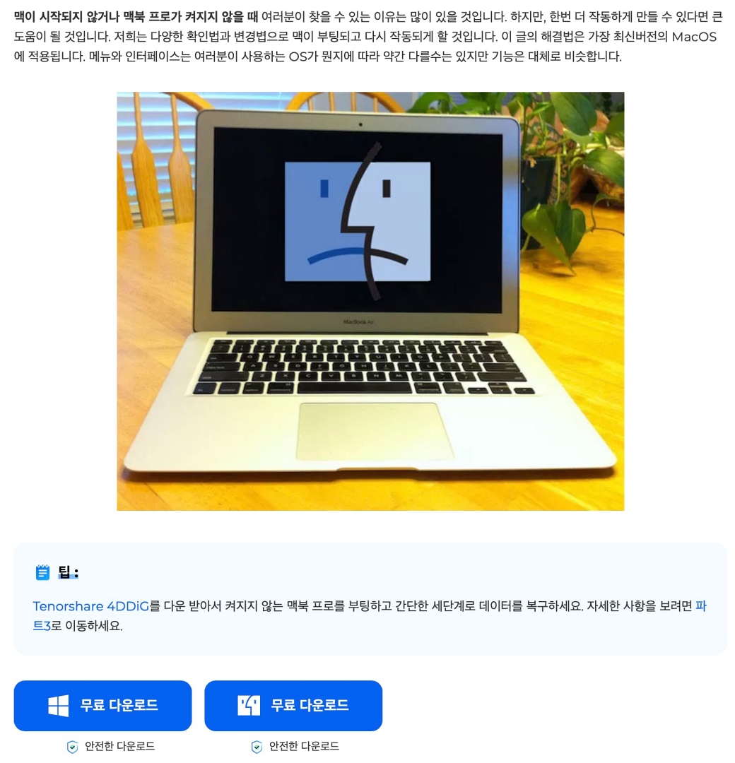 이런 경우는 저도 한 번도 없었기 때문에 사용해 본 적이 없는데 테너쉐어 4DDiG Data Recovery로 복구 디스크를 USB에 만들어서 USB 메모리를 맥에 연결해 부팅하게 됩니다.