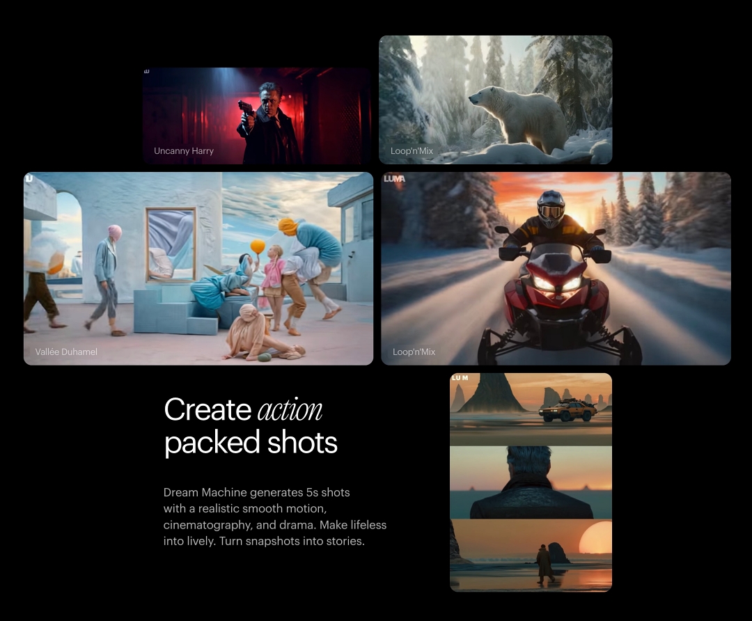 루마 AI 드림머신의 베타테스터들은 드림 머신의 유동적인 모션과 일관된 스토리텔링, 특정 객체, 캐릭터, 동작 및 환경을 충실하게 렌더링 하는 능력을 높이 평가했습니다.