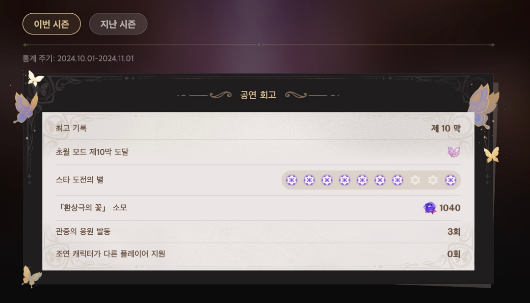 이번 시즌 제 기록은 초월 모드에서 10막까지 달성 했지만 8막과 9막은 별은 획득하지 못했지만 10막 까지 클리어했습니다.