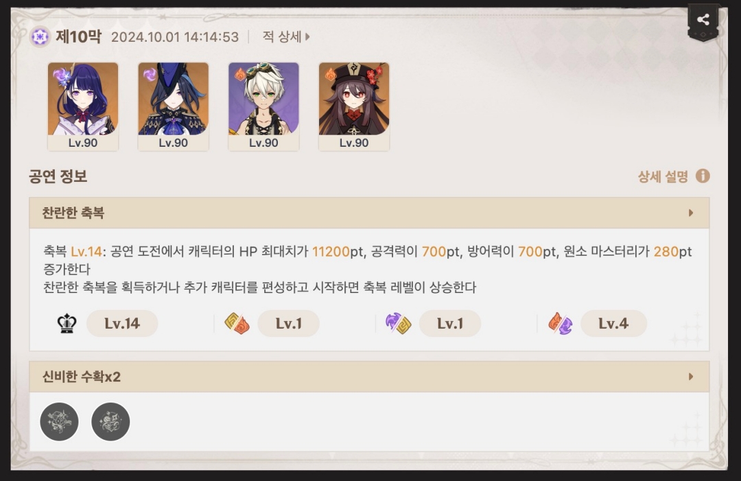 어려움 모드는 8막까지 초월 모드는 10막까지이며 아마 현실 속 환상극 때문에 요즘 초대할 캐릭터의 돌파가 높은 친구를 찾거나 그동안 활용하지 않던 4성 캐릭터도 키우는 분들도 있을 것 같습니다.